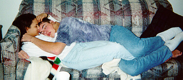 Falen, Nathalie, and Kenai reclining on a couch.